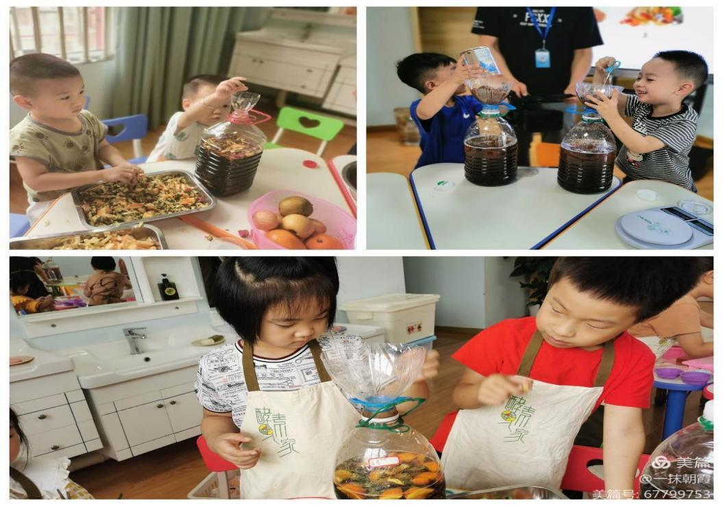 在幼兒園垃圾分類過程中,如何處理廚余垃圾一直是道難題,特別是到了夏季,水果和蔬菜的消耗量增加,就會產生大量果皮、蔬菜皮。談及為什么選擇“酵素制作”作為科教融合新途徑,園長李愛芳表示,“制作環(huán)保酵素需要的材料只是空瓶和紅糖,對于幼兒來說是可以完成的。”