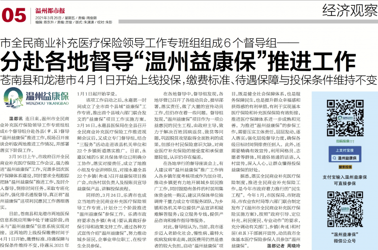 同樣的,3月24日,樂清市也成立當(dāng)?shù)氐娜裆虡I(yè)補(bǔ)充醫(yī)療保險領(lǐng)導(dǎo)工作專班,計(jì)劃分三個階段推進(jìn)“溫州益康保”參保工作。樂清市政府要求各鄉(xiāng)鎮(zhèn)(街道)要認(rèn)真做好參保引導(dǎo)和政策支持工作,通過各種方式宣傳介紹“溫州益康!,努力推動城鄉(xiāng)居民,企事業(yè)單位職工、在校學(xué)生全員參保。
