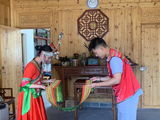 景寧澄照鄉(xiāng)金坵村是一個典型的畬漢群眾聚居的特色村落,畬族人口數(shù)占總?cè)丝跀?shù)的42%,曾獲中國傳統(tǒng)村落、省民族十佳特色村寨等榮譽(yù)。在一間別有生趣的茶室,實(shí)踐團(tuán)學(xué)生們見到了現(xiàn)任村黨總支書記蘭文忠,饒有興趣地傾聽金坵村蝶變的故事。金坵村——這個過去人均年收入僅為185元的小山村,如今已成為人均年收入超3.17萬元、村集體資產(chǎn)超千萬元的小康村。蘭文忠書記自豪地說,在金坵一眼就能認(rèn)出迎面走來的村民是畬族還是漢族——村里的畬民一年四季都穿畬服,村里還給他們發(fā)放傳統(tǒng)服飾的置裝補(bǔ)貼。目前,村里將畬鄉(xiāng)傳統(tǒng)文化創(chuàng)新為特色的鄉(xiāng)村文旅,和旅游公司合作打造畬族婚嫁習(xí)俗等相關(guān)展演。據(jù)悉,金坵村在2021年的游客量達(dá)到20余萬人次,村集體經(jīng)濟(jì)年收入超50萬元,真正實(shí)現(xiàn)了民族文化賦能鄉(xiāng)村增彩。