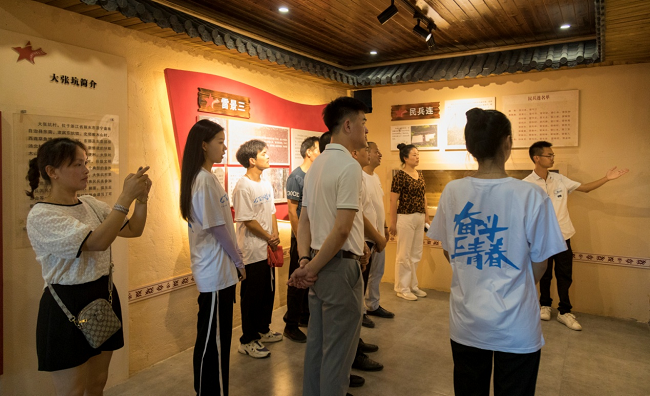 在畬族革命歷史展覽館外墻,紅色大字寫道:“畬族有很好的革命傳統(tǒng),在整個大革命時期,畬族沒有出過一個叛徒,這是很了不起的事情。”這副大字是習(xí)近平總書記的標(biāo)注。在展廳內(nèi),實(shí)踐團(tuán)成員們認(rèn)真學(xué)習(xí)景寧畬族革命斗爭史和大張坑村革命斗爭事跡,感悟畬族人民前赴后繼、英勇抗?fàn)幍摹爸矣隆本!拔覀兠考颐繎舳紥熘蠹t燈籠,夜晚很美。就像紅軍點(diǎn)燃的火種,世代傳承、守護(hù)著村民!贝髲埧哟逦幕Y堂工作人員這樣給學(xué)生們介紹道。