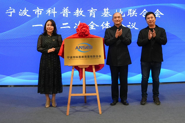 聯(lián)合會第一屆會員大會第二次全體會議上,寧波市科普教育基地聯(lián)合會理事長周赤明、副理事長朱海燕和吳棟為寧波市科普教育基地聯(lián)合會揭牌。