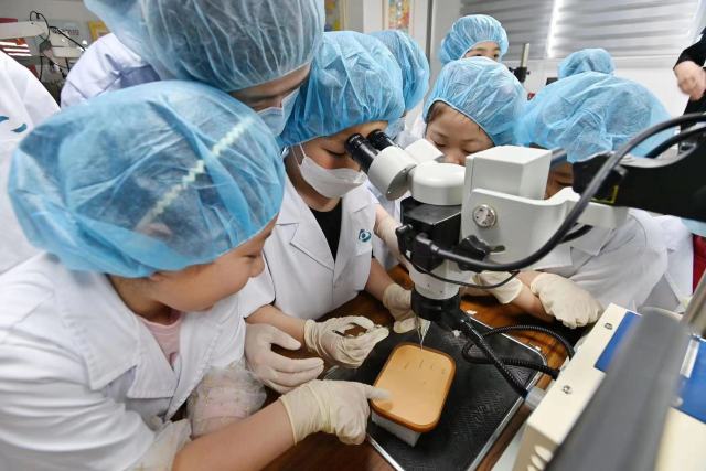 在微觀體驗室,孩子們學(xué)習(xí)了規(guī)范的七步洗手法,第一次用外科顯微鏡觀察了傷口縫合,用手術(shù)剪刀給傷口拆線。科普館工作人員張赟告訴記者,這一看一剪,主要考驗手眼協(xié)調(diào)能力,同時他也想告訴大家,眼睛是很嬌弱的器官,要好好保護眼睛。