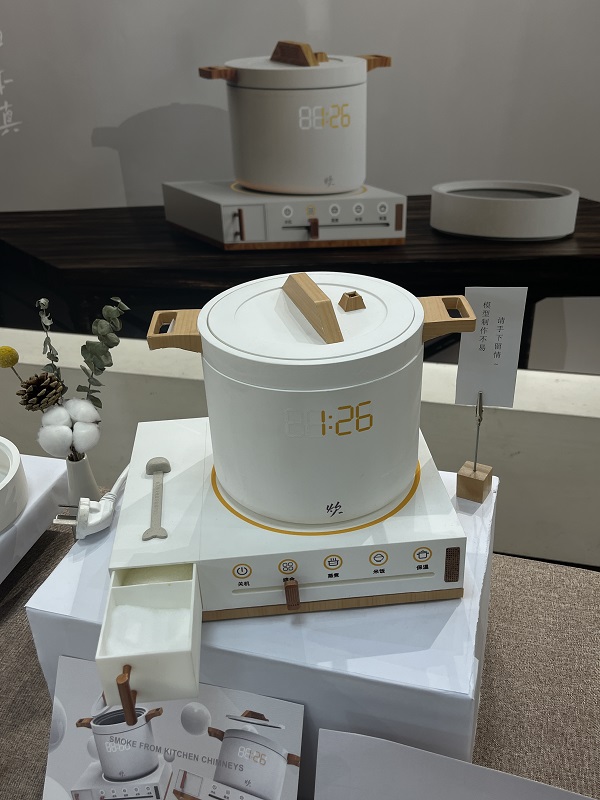 一個“老式鍋”電飯鍋吸引了不少師生,這是數(shù)字化適老產(chǎn)品設(shè)計項目“炊”。作者江欣怡在調(diào)研過程中發(fā)現(xiàn)獨居老人在生活中往往會有“一頓菜吃一天”的現(xiàn)象,非常不利于老年群體的營養(yǎng)均衡,尤其是“三高”老年人群。而在情感方面,獨居老人又希望能夠與子女們有更多的互動交流。