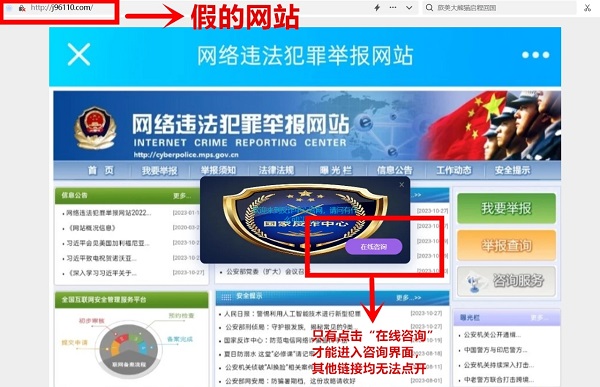 到底是什么網(wǎng)站讓吳先生深信不疑?為了一探究竟,民警打開某網(wǎng)站,屏幕上立即彈出“網(wǎng)絡(luò)違法犯罪舉報網(wǎng)站”頁面,粗粗一看,逼真的網(wǎng)頁也差點讓陳亮信以為真,細(xì)看之下,陳亮發(fā)現(xiàn)網(wǎng)頁的清晰度非常低,點擊頁面試圖查看相關(guān)鏈接內(nèi)容沒有任何反應(yīng),沒多久頁面接直接跳到報警入口,很快對方發(fā)來信息:“您好,這里是反詐騙報案官網(wǎng),請問您是否遭遇了網(wǎng)絡(luò)詐騙?”