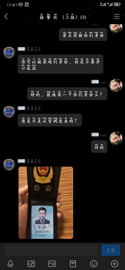 民警假裝自己受騙,對方要求提供信息進(jìn)行網(wǎng)上立案,信息中除了姓名、身份證號、被騙時間、數(shù)額、原因及聯(lián)系電話等正常信息外,居然還要求提供QQ賬號。果不其然,沒多久,對方發(fā)來一個名為“專案網(wǎng)警警官”的QQ群號”讓民警添加后進(jìn)行處理。當(dāng)民警質(zhì)疑對方身份真實性,對方立即將一張警官證發(fā)了過來,當(dāng)民警提出視頻核實時,遭到對方拒絕,并將其拉黑。