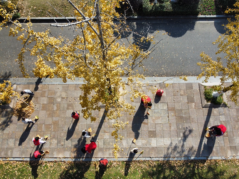 浙江長興太湖街道志愿者清掃落葉