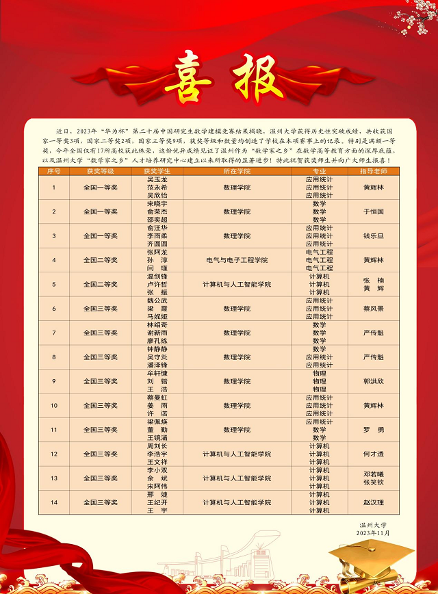 近日,2023年“華為杯”第二十屆中國(guó)研究生數(shù)學(xué)建模競(jìng)賽結(jié)果揭曉。溫州大學(xué)獲歷史性突破成績(jī),共收獲國(guó)家一等獎(jiǎng)3項(xiàng)(數(shù)理學(xué)院指導(dǎo)3項(xiàng)),國(guó)家二等獎(jiǎng)2項(xiàng)(數(shù)理學(xué)院指導(dǎo)1項(xiàng)、計(jì)算機(jī)學(xué)院指導(dǎo)1項(xiàng)),國(guó)家三等獎(jiǎng)9項(xiàng)(數(shù)理學(xué)院指導(dǎo)6項(xiàng)、計(jì)算機(jī)學(xué)院指導(dǎo)3項(xiàng)),獲獎(jiǎng)等級(jí)與數(shù)量均創(chuàng)造了學(xué)校在本項(xiàng)賽事上的記錄。據(jù)悉,由于賽制規(guī)定,一個(gè)參賽學(xué)校最多只能獲得3項(xiàng)國(guó)家一等獎(jiǎng),今年全國(guó)僅有17個(gè)高校獲得滿(mǎn)額。此次殊榮體現(xiàn)了溫州作為“數(shù)學(xué)家之鄉(xiāng)”在數(shù)學(xué)高等教育方面的深厚底蘊(yùn),見(jiàn)證了溫州大學(xué)“數(shù)學(xué)家之鄉(xiāng)”人才培養(yǎng)研究中心建立以來(lái)所取得的顯著進(jìn)步,也顯示了溫州大學(xué)近年來(lái)加強(qiáng)數(shù)學(xué)建模教學(xué)和培訓(xùn)團(tuán)隊(duì)建設(shè)的具體成果。