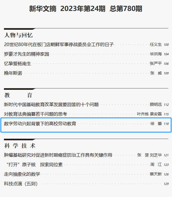 近日,浙江工商大學(xué)工商管理學(xué)院徐蕾教授撰寫(xiě)的論文《數(shù)字勞動(dòng)興起背景下的高校勞動(dòng)教育》被《新華文摘》2023年第24期全文轉(zhuǎn)載。