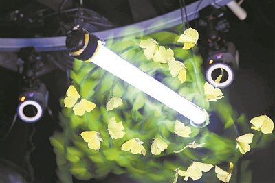 英國帝國理工學院的動作捕捉飛行場內,鉤粉蝶繞著紫外燈飛行。