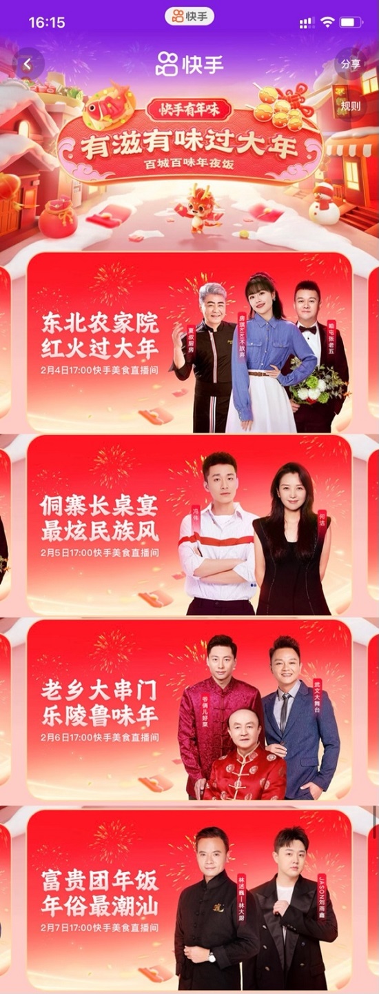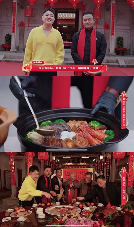 百城百味年夜飯,有滋有味過(guò)大年,2月4日至2月7日,快手將鏡頭推向老百姓的新年餐桌,與明星何潔,國(guó)宴名廚@夏叔廚房、@馮偉Nemo、@爺倆兒好菜高炳義師徒、@林述巍,以及快手創(chuàng)作者@房琪kiki不放棄、@咱屯張老五、@武文大舞臺(tái)、@JASON劉雨鑫,走進(jìn)東北四平、貴州侗寨、山東樂(lè)陵、廣州潮汕四地,大秀廚藝解鎖普通人的年夜飯新菜單。在一道道美食烹制的過(guò)程中,不僅還原了當(dāng)?shù)靥厣L(fēng)味,更抒發(fā)了大家對(duì)團(tuán)圓的滿足與期待。
