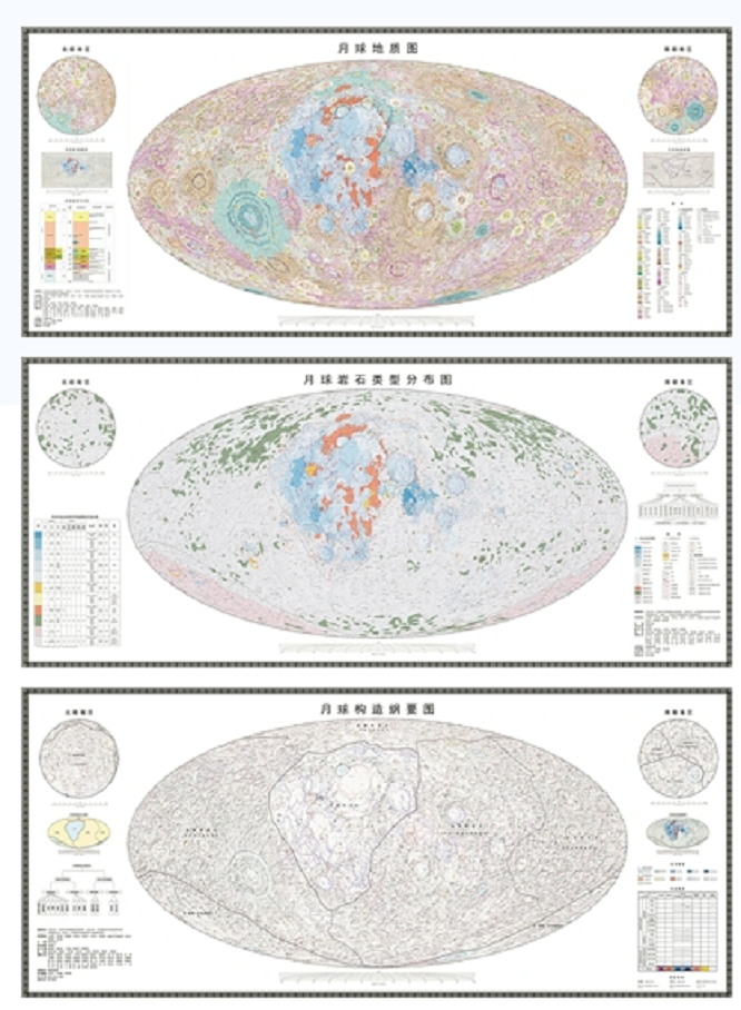據(jù)悉,《1∶250萬月球全月地質(zhì)圖集》包含《1∶250萬月球全月地質(zhì)圖》《1∶250萬月球巖石類型分布圖》和《1∶250萬月球構(gòu)造綱要圖》,《1∶250萬月球分幅地質(zhì)圖集》包含30幅月球標準分幅地質(zhì)圖。