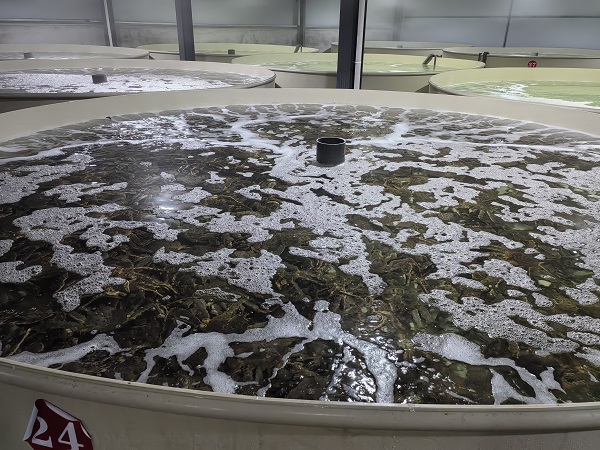 即使是夏天,一走進(jìn)養(yǎng)殖基地,也不由讓人倒吸一口冷氣。在現(xiàn)場,記者注意到車間內(nèi)的水質(zhì)在線監(jiān)測系統(tǒng),包括溶氧、水溫、pH值、鹽度等關(guān)鍵指標(biāo)實(shí)時(shí)顯示著,其中,水溫一欄顯示的溫度在3.9°C到4.1°C之間!暗弁跣分悄芄S化暫養(yǎng)技術(shù)在舟山市‘揭榜掛帥’科技攻關(guān)項(xiàng)目支持下,開展了帝王蟹工廠化循環(huán)水暫養(yǎng)環(huán)境快速精準(zhǔn)感知技術(shù)研究和智能化養(yǎng)殖系統(tǒng)集成,構(gòu)建了包括海水制冷系統(tǒng)、循環(huán)水處理系統(tǒng)、增氧系統(tǒng)、水質(zhì)在線監(jiān)測等帝王蟹智能工廠化循環(huán)水養(yǎng)殖系統(tǒng),高度仿生帝王蟹的原產(chǎn)地環(huán)境,打造帝王蟹最佳生存環(huán)境。”肖金星介紹,帝王蟹暫養(yǎng)期間,他們還做到了讓帝王蟹不減重。