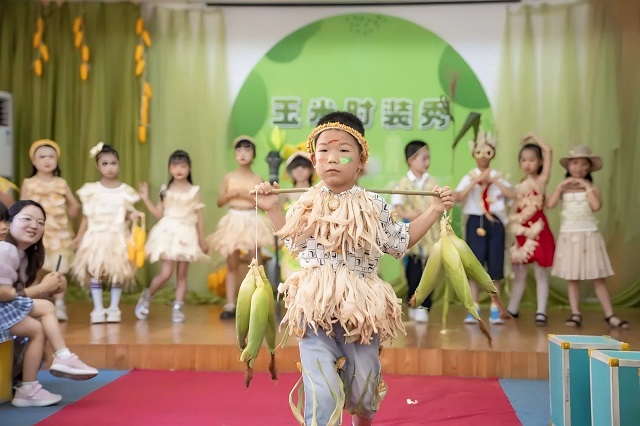 在散學(xué)式的玉米時(shí)裝秀現(xiàn)場(chǎng),玉米實(shí)現(xiàn)了華麗變身,造型多樣的手工藝品,色香味俱全的玉米美食,時(shí)尚的玉米裝扮,學(xué)生們發(fā)揮自己的小巧思,讓玉米元素綻放在校園的每一個(gè)角落。