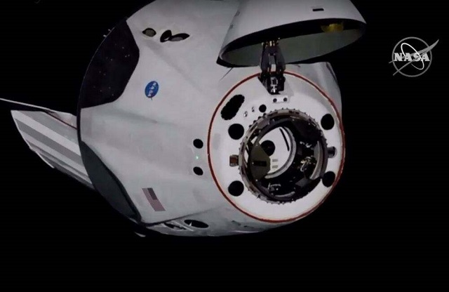 這張由美國航天局2020年5月31日發(fā)布的視頻截圖顯示美國太空探索技術(shù)公司“龍”飛船正在與國際空間站對接。新華社發(fā)(美國航天局供圖)