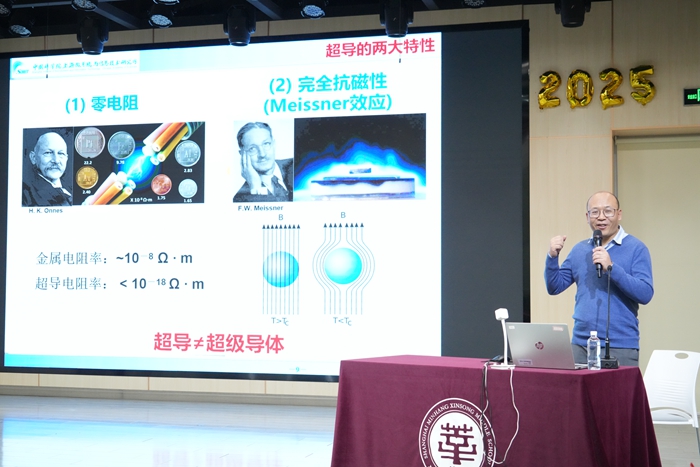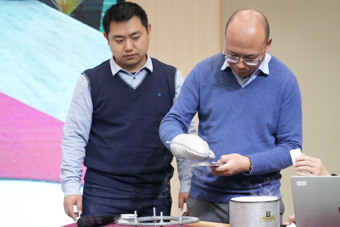 從溫度的概念入手,彭煒介紹了華氏溫標(biāo)、攝氏溫標(biāo)和熱力學(xué)溫標(biāo)的發(fā)展歷史,并深入淺出地講解了絕對(duì)零度對(duì)物理學(xué)研究的意義。通過(guò)展示低溫技術(shù)對(duì)物質(zhì)狀態(tài)和性能的影響,同學(xué)們對(duì)“低溫世界”有了全新的認(rèn)識(shí)。隨后,彭煒通過(guò)形象的比喻和演示,讓同學(xué)們直觀感受到超導(dǎo)體的獨(dú)特魅力。