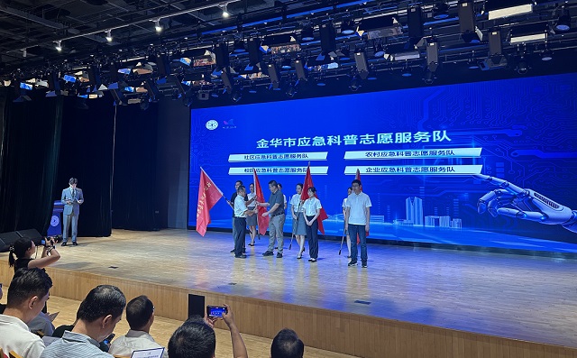金華市科協(xié)黨組書記、主席施怡偉為社區(qū)應(yīng)急科普志愿服務(wù)隊、農(nóng)村應(yīng)急科普志愿服務(wù)隊、校園應(yīng)急科普志愿服務(wù)隊、企業(yè)應(yīng)急科普志愿服務(wù)隊等4支應(yīng)急科普志愿服務(wù)隊授旗。