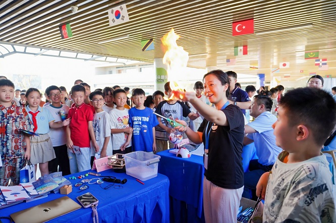浙江省科普聯(lián)合會(huì)靠譜傳播團(tuán)隊(duì)成員仰晗、陳林孝帶來(lái)的科學(xué)實(shí)驗(yàn)秀《兩山有理:地球健康實(shí)驗(yàn)室》,通過(guò)妙趣橫生的互動(dòng)實(shí)驗(yàn),成功點(diǎn)燃在場(chǎng)學(xué)生對(duì)科學(xué)探索的好奇與熱情。