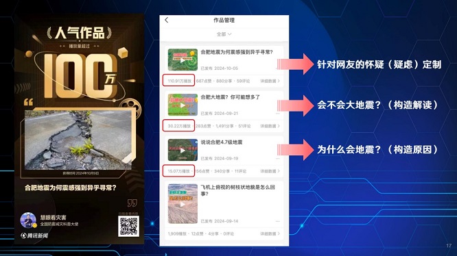第一篇從地質(zhì)構(gòu)造角度,解讀該區(qū)域?yàn)楹螘?huì)發(fā)生地震;第二篇從構(gòu)造特征與歷史數(shù)據(jù)出發(fā),分析后續(xù)發(fā)生強(qiáng)震的概率為何較低;第三篇是針對(duì)網(wǎng)絡(luò)熱議話題——“震感這么強(qiáng),是不是地震局改了震級(jí)?”——專門澄清誤解,解釋震感與震級(jí)、震源深度、地質(zhì)條件的關(guān)系。這三支視頻發(fā)布后,傳播效果良好,評(píng)論區(qū)反饋積極。尤其是第三條,直接回應(yīng)了公眾疑慮,起到了“止謠于未起”的作用。