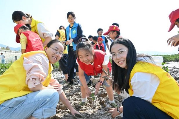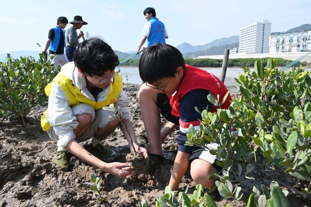 “紅樹苗什么時候會長高呀?”“它會喜歡這里嗎?”灘涂上,小學(xué)生們化身為“灘涂園丁”,擼起袖子和褲腿,與本碩博黨員志愿者們一道,深一腳淺一腳地踩進(jìn)柔軟的灘涂里,種下一株株紅樹苗。