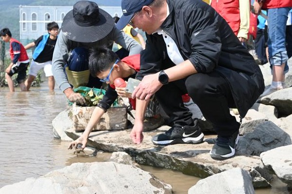 隨后,小學(xué)生們領(lǐng)取“青蟹習(xí)性卡片”及蟹苗,通過任務(wù)卡了解青蟹的生活習(xí)性后,有序地將它們放歸灘涂,并用手機記錄下這美好瞬間。