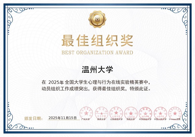 日前,第三屆全國大學(xué)生心理與行為在線實驗精英賽總決賽在中央財經(jīng)大學(xué)落幕。溫州大學(xué)學(xué)子憑借扎實的專業(yè)功底與創(chuàng)新的實驗設(shè)計,從6694名參賽者中脫穎而出,斬獲研究生全國特等獎、本科生全國三等獎的優(yōu)異成績。徐平老師、顧昕宇老師獲評優(yōu)秀指導(dǎo)老師,徐平老師獲十佳指導(dǎo)老師,學(xué)校亦榮膺最佳組織獎,實現(xiàn)師生與集體榮譽的多重突破。