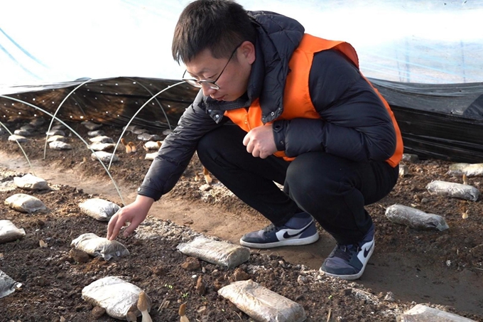 平安農(nóng)險(xiǎn)人員陳恒威查看羊肚菌營養(yǎng)包吸收情況 蔣飛/攝